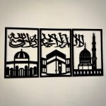 This Three Frames Kalma Islamic Wooden Art 2024 showcases intricate carving and hand-painted designs in a stylish and durable wooden frame. Perfect for any home, this art piece features a modern take on traditional Islamic design elements, adding a touch of culture and beauty to any room.